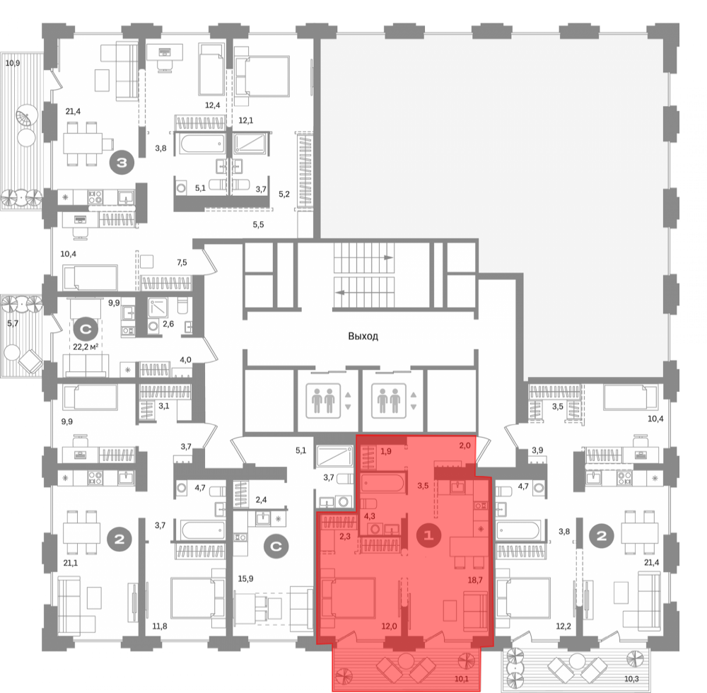 В проекте предложено 50 вариантов планировочных решений. На первых и последних этажах — уникальные форматы: с террасами, отдельным входом, двухуровневые. Их всего 126. На последних этажах башен предложены квартиры со вторым светом, несколькими террасами, бассейном, сауной, дымоходом под камин, помещениями под зимний сад. Все квартиры сдаются с подчистовой отделкой.