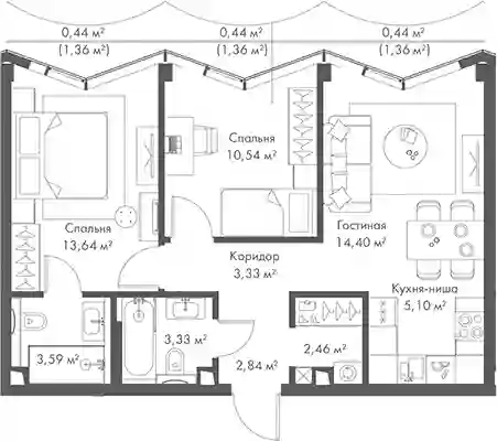 44 533 152 ₽3-к.квартира, 62.1 м², 13 эт.