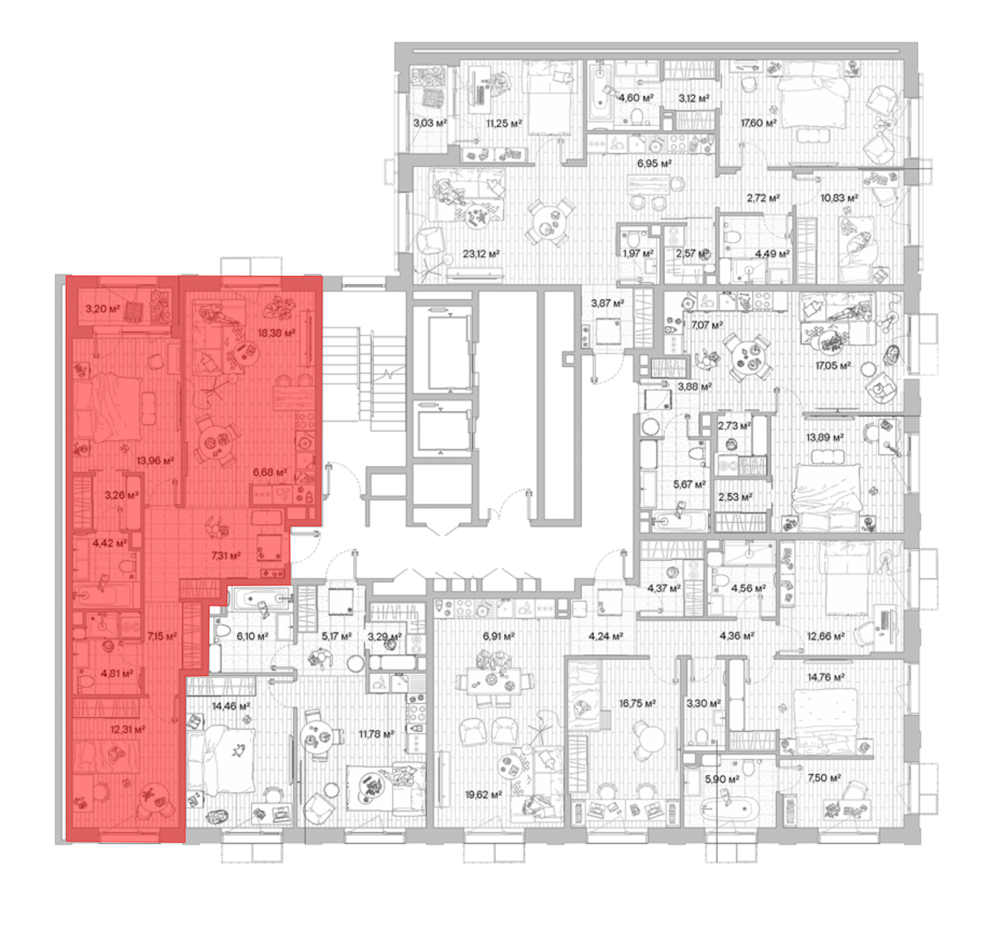 Планировочные решения включают как классические форматы, так и европланировки. Квартиры сдаются без отделки, с потолками высотой 3,1 метра и увеличенной площадью остекления. В некоторых квартирах предусмотрены просторные террасы.