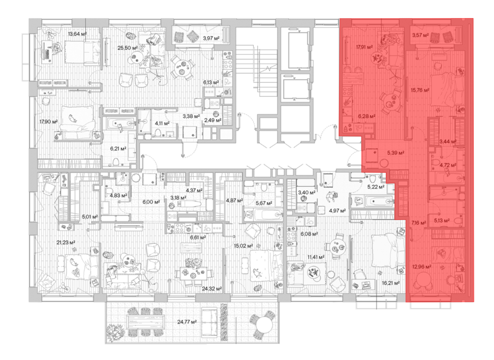 Планировочные решения включают как классические форматы, так и европланировки. Квартиры сдаются без отделки, с потолками высотой 3,1 метра и увеличенной площадью остекления. В некоторых квартирах предусмотрены просторные террасы.