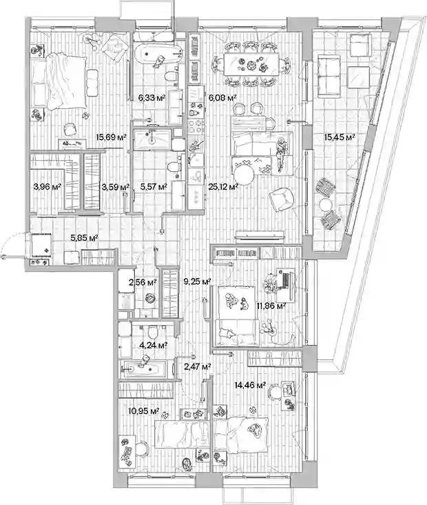 Планировочные решения включают как классические форматы, так и европланировки. Квартиры сдаются без отделки, с потолками высотой 3,1 метра и увеличенной площадью остекления. В некоторых квартирах предусмотрены просторные террасы.