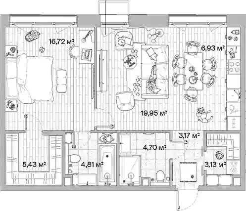 Планировочные решения включают как классические форматы, так и европланировки. Квартиры сдаются без отделки, с потолками высотой 3,1 метра и увеличенной площадью остекления. В некоторых квартирах предусмотрены просторные террасы.