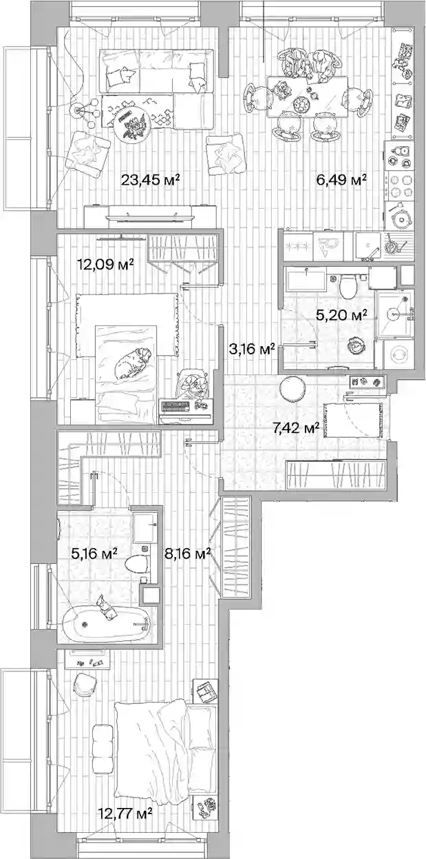 Планировочные решения включают как классические форматы, так и европланировки. Квартиры сдаются без отделки, с потолками высотой 3,1 метра и увеличенной площадью остекления. В некоторых квартирах предусмотрены просторные террасы.
