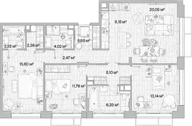 Планировочные решения включают как классические форматы, так и европланировки. Квартиры сдаются без отделки, с потолками высотой 3,1 метра и увеличенной площадью остекления. В некоторых квартирах предусмотрены просторные террасы.