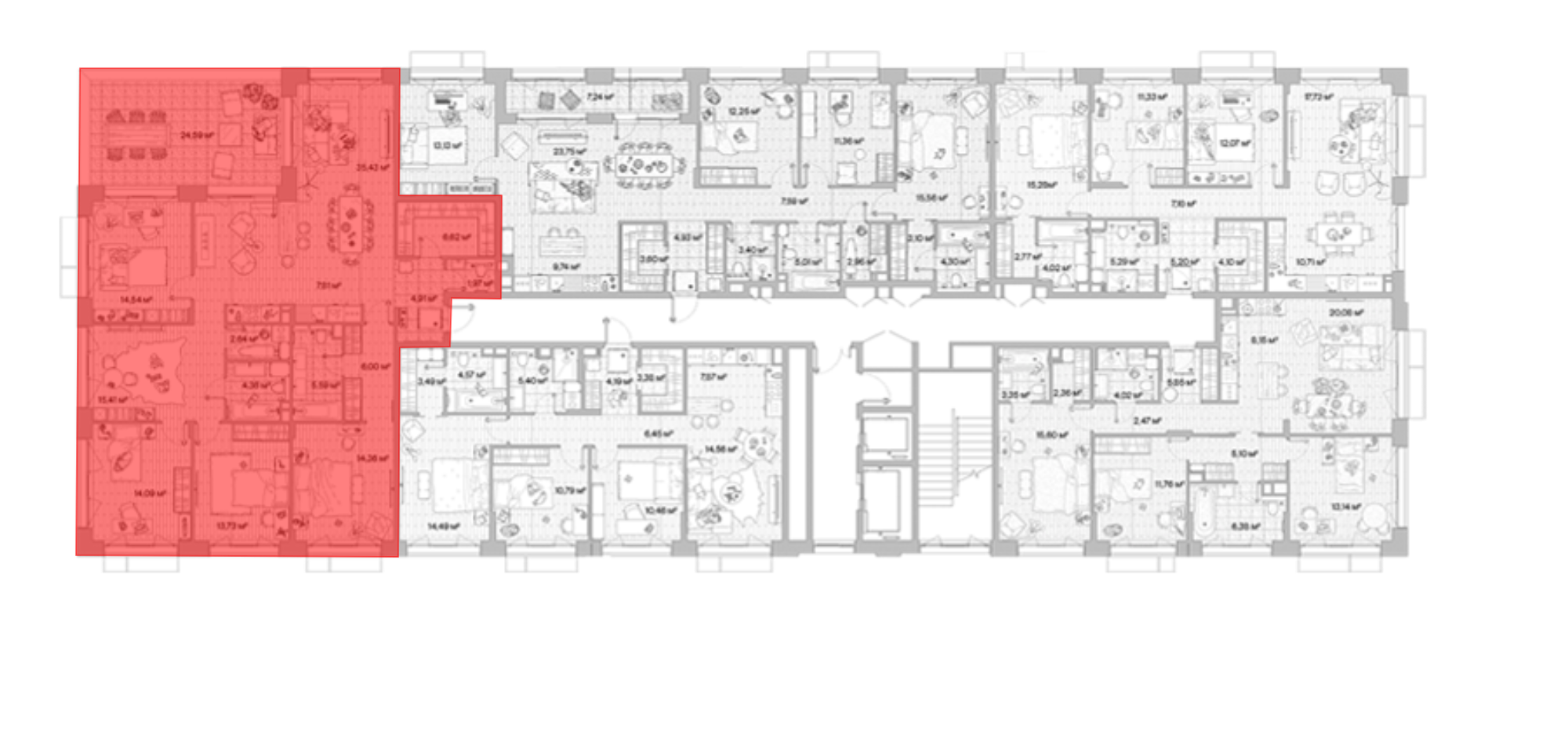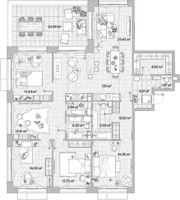 Планировочные решения включают как классические форматы, так и европланировки. Квартиры сдаются без отделки, с потолками высотой 3,1 метра и увеличенной площадью остекления. В некоторых квартирах предусмотрены просторные террасы.