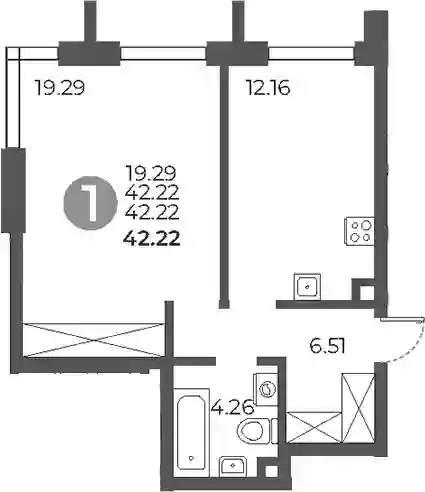 19 839 648 ₽1-к.квартира, 42.22 м², 3 эт.