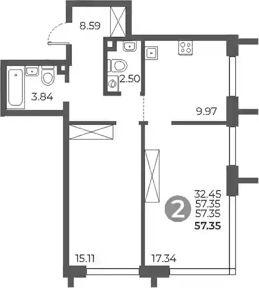 22 339 813 ₽3-к.квартира, 57.38 м², 15 эт.