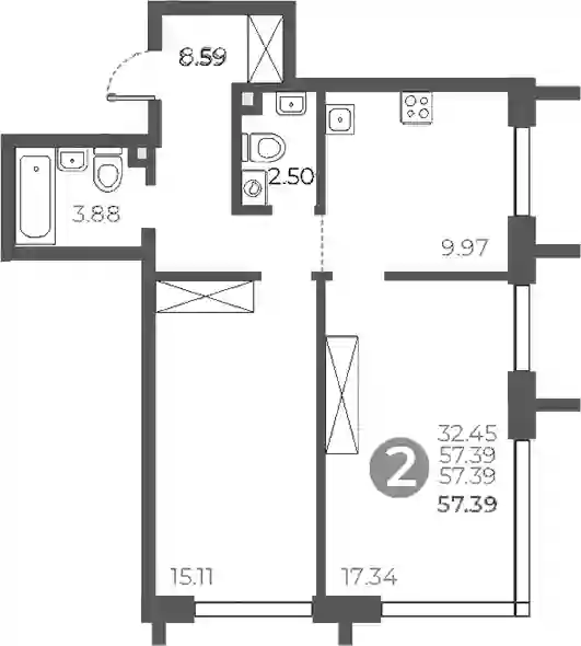 22 339 813 ₽3-к.квартира, 57.38 м², 15 эт.