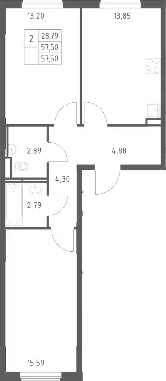 13 432 194 ₽2-к.квартира, 57.53 м², 9 эт.