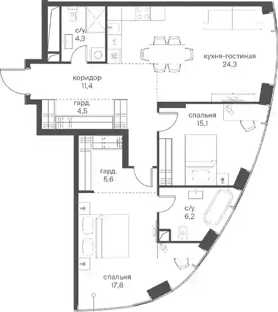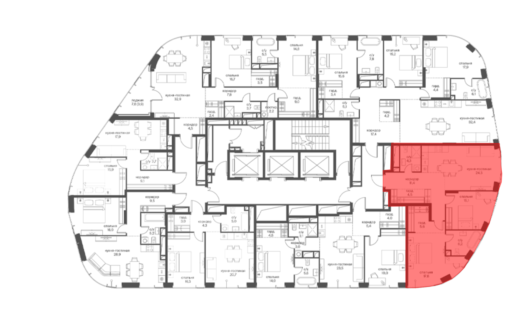 В комплексе предложен большой выбор элитных лотов: от функциональных однокомнатных квартир до семейных резиденций и пентхаусов со вторым светом. Есть и редкие форматы: с окнами в ванных, молированным угловым остеклением, возможностью установки камина. В квартирах спроектированы панорамные окна «в пол» и двухстворчатые двери. В более чем 50% квартир предусмотрены террасы, лоджии и балконы. Квартиры сдаются без отделки и внутренних перегородок.