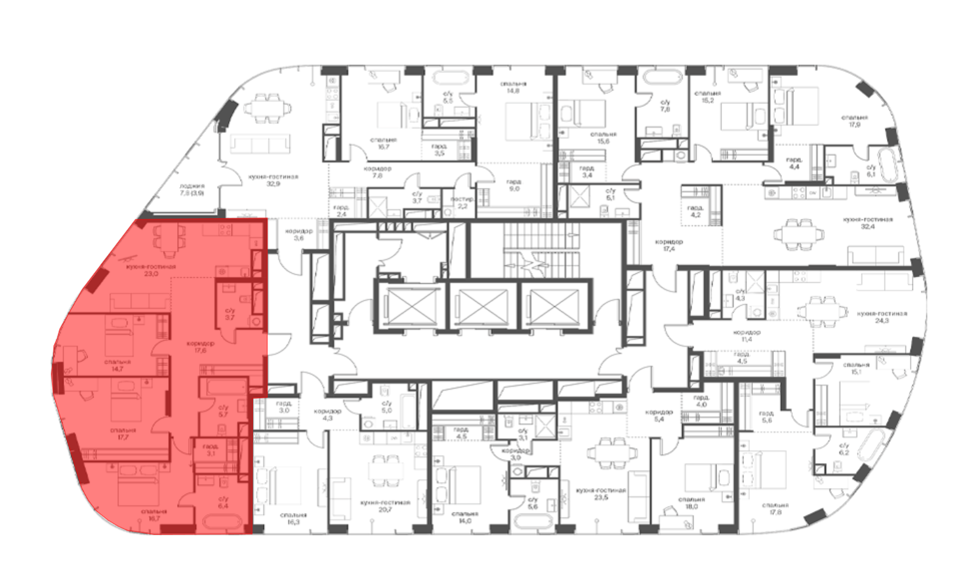 В проекте представлены студии и квартиры с 1–5 комнатами площадью от 34 до 264 кв. м. Доступны уникальные планировочные решения: лоты с террасами, лоджиями, окнами в ванной и панорамными видами на Москву-Сити. В квартирах установлены панорамные окна из алюминиевого профиля премиум-класса. Жилье передается без отделки. Предусмотрена система умного дома.