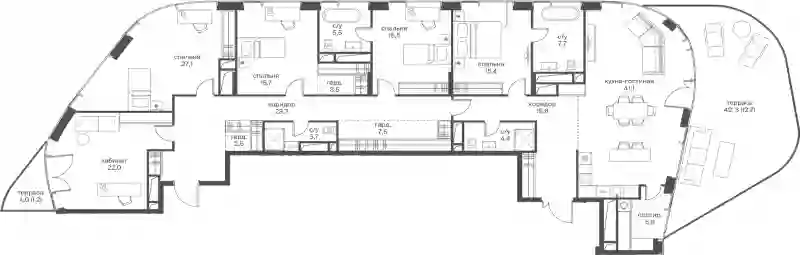 В проекте представлены студии и квартиры с 1–5 комнатами площадью от 34 до 264 кв. м. Доступны уникальные планировочные решения: лоты с террасами, лоджиями, окнами в ванной и панорамными видами на Москву-Сити. В квартирах установлены панорамные окна из алюминиевого профиля премиум-класса. Жилье передается без отделки. Предусмотрена система умного дома.