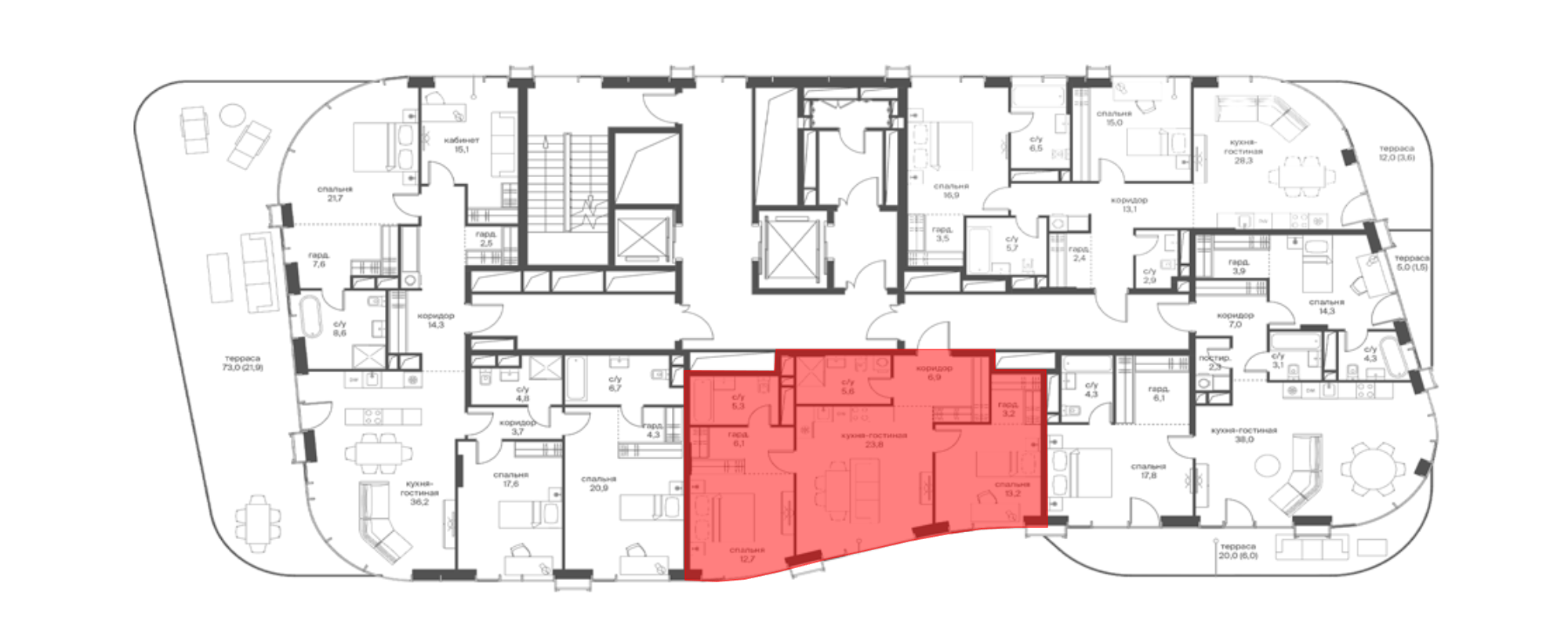 В проекте представлены студии и квартиры с 1–5 комнатами площадью от 34 до 264 кв. м. Доступны уникальные планировочные решения: лоты с террасами, лоджиями, окнами в ванной и панорамными видами на Москву-Сити. В квартирах установлены панорамные окна из алюминиевого профиля премиум-класса. Жилье передается без отделки. Предусмотрена система умного дома.