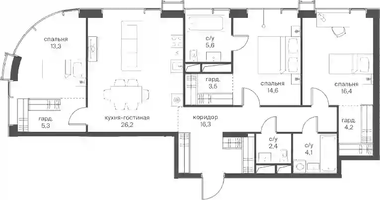 В проекте представлены студии и квартиры с 1–5 комнатами площадью от 34 до 264 кв. м. Доступны уникальные планировочные решения: лоты с террасами, лоджиями, окнами в ванной и панорамными видами на Москву-Сити. В квартирах установлены панорамные окна из алюминиевого профиля премиум-класса. Жилье передается без отделки. Предусмотрена система умного дома.