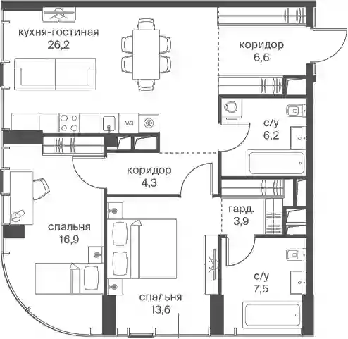 В проекте представлены студии и квартиры с 1–5 комнатами площадью от 34 до 264 кв. м. Доступны уникальные планировочные решения: лоты с террасами, лоджиями, окнами в ванной и панорамными видами на Москву-Сити. В квартирах установлены панорамные окна из алюминиевого профиля премиум-класса. Жилье передается без отделки. Предусмотрена система умного дома.