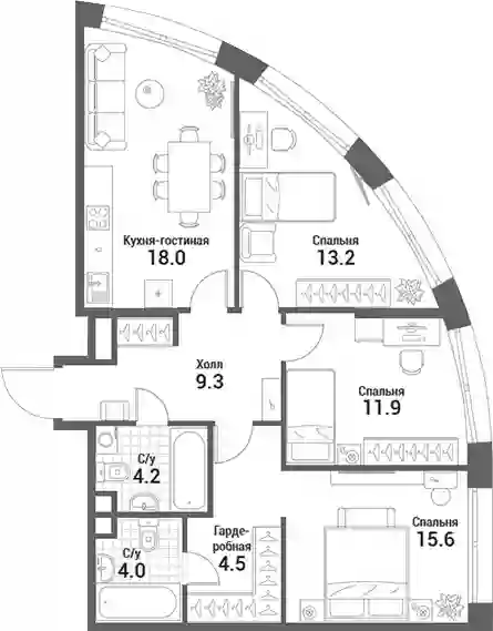 В проекте представлены квартиры с 1–4 спальнями в формате европланировок с панорамными окнами и потолками до 3,5 метров. Помещения идут без стен, что позволяет владельцам организовать пространство по собственному вкусу. Также доступны варианты с полной отделкой, включая дизайн-проект под ключ с мягкой мебелью или с кухней и встроенной бытовой техникой.