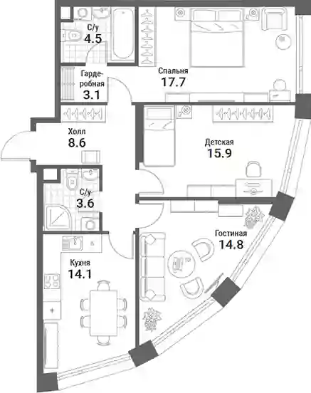 В проекте представлены квартиры с 1–4 спальнями в формате европланировок с панорамными окнами и потолками до 3,5 метров. Помещения идут без стен, что позволяет владельцам организовать пространство по собственному вкусу. Также доступны варианты с полной отделкой, включая дизайн-проект под ключ с мягкой мебелью или с кухней и встроенной бытовой техникой.