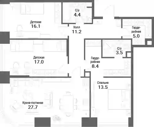 В проекте представлены квартиры с 1–4 спальнями в формате европланировок с панорамными окнами и потолками до 3,5 метров. Помещения идут без стен, что позволяет владельцам организовать пространство по собственному вкусу. Также доступны варианты с полной отделкой, включая дизайн-проект под ключ с мягкой мебелью или с кухней и встроенной бытовой техникой.