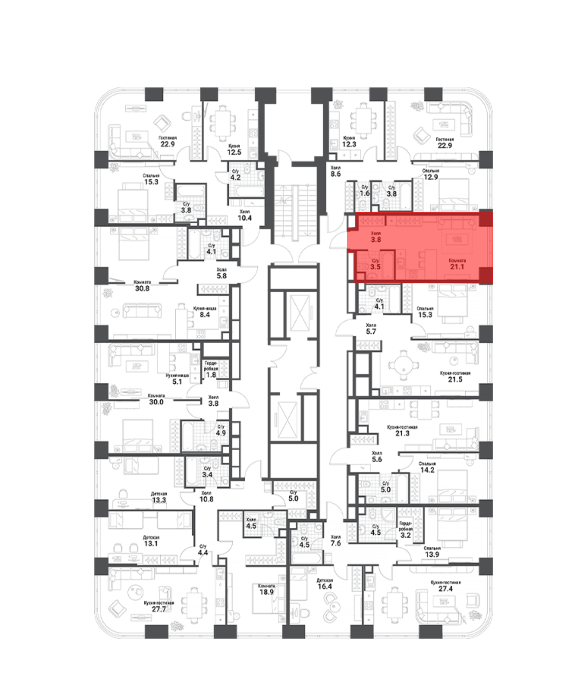 В проекте представлены квартиры с 1–4 спальнями в формате европланировок с панорамными окнами и потолками до 3,5 метров. Помещения идут без стен, что позволяет владельцам организовать пространство по собственному вкусу. Также доступны варианты с полной отделкой, включая дизайн-проект под ключ с мягкой мебелью или с кухней и встроенной бытовой техникой.