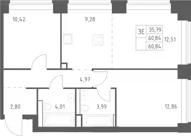 3-к.квартира, 60.84 м², 13 эт. в ЖК NOVA Корпус 1