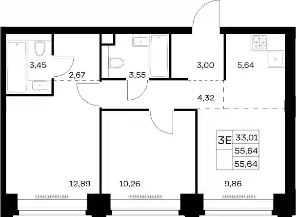 3-к.квартира, 55.64 м², 32 эт. в ЖК NOVA Корпус 3
