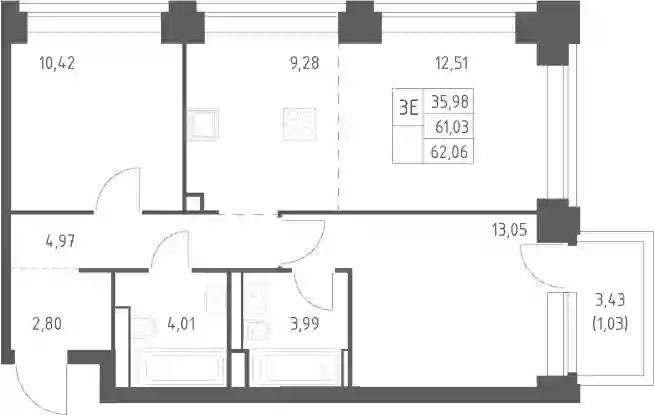 60 910 615 ₽3-к.квартира, 60.97 м², 12 эт.