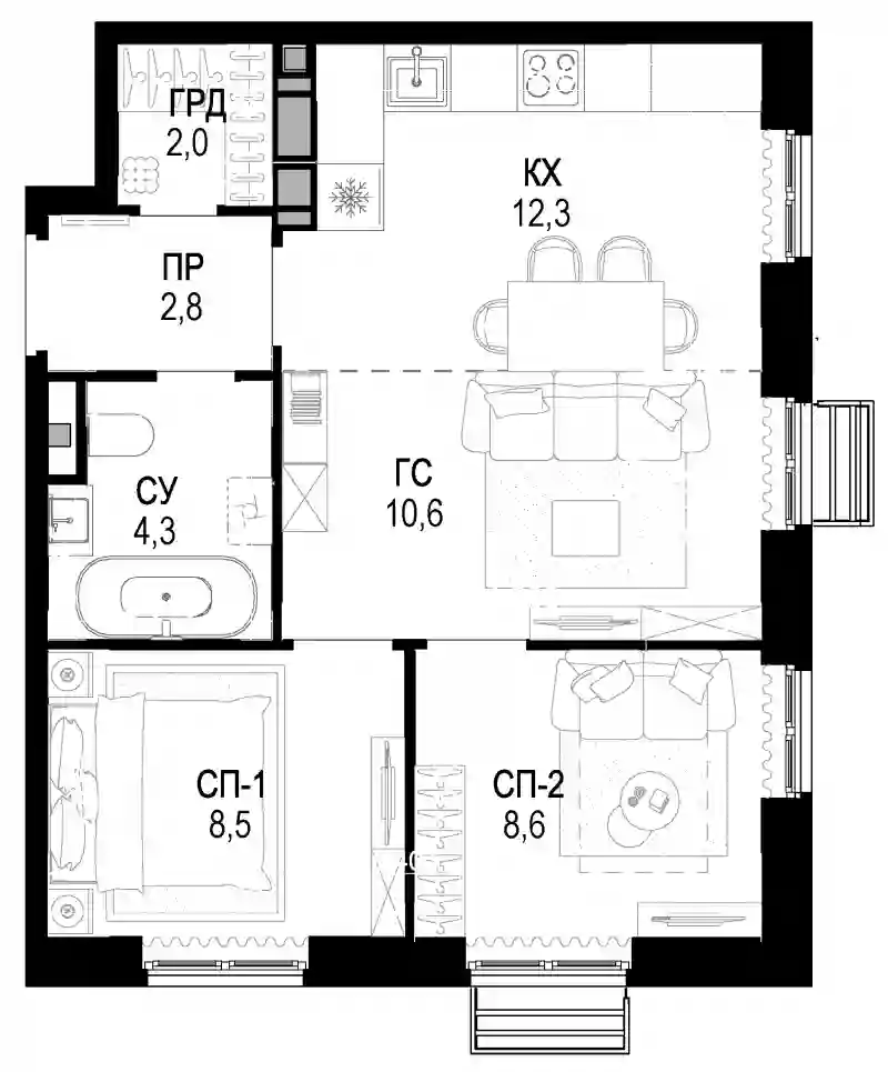 В проекте представлены квартиры с 1–3 комнатами, а также апартаменты, которые занимают 4–8 этажи. Планировки продуманы с учетом разных сценариев жизни, доступны евроформаты с объединенной кухней-гостиной. Все помещения имеют увеличенные окна, высота потолков достигает 3 м. Объекты передаются без внутренних перегородок.