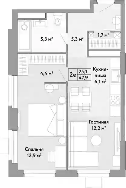2-к.квартира, 47.9 м², 13 эт. в ЖК Новые Смыслы Корпус 1