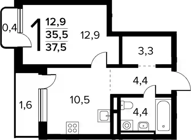 2-к.квартира, 35.5 м², 9 эт. в ЖК Новые Ватутинки мкрн. Заречный Корпус 6/9