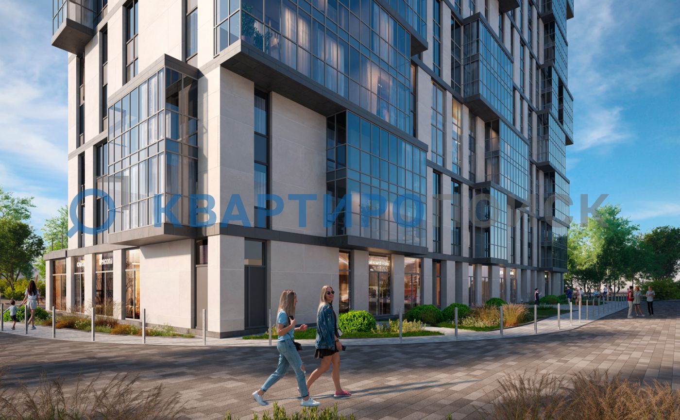 На 1 этаже здания находится множество торговых точек и услуг, включая большой детский центр с игровой и образовательной зонами. Здесь также работают спортивные и детские клубы, медицинский центр, ресторан, супермаркет и центр Сообщества. В деловой части здания располагаются офисы и фуд-корт. Между корпусами обустроен уютный двор-сад, где можно насладиться спокойствием в арт-зонах с гамаками, поработать на свежем воздухе в коворкинге или отдохнуть на шезлонгах у пруда. Здесь также есть детские игровые площадки, воркаут-зона и кинотеатр под открытым небом. Для владельцев автомобилей в комплексе предусмотрен подземный паркинг с зимним садом, пунктом подкачки колес и зарядками для электромобилей.