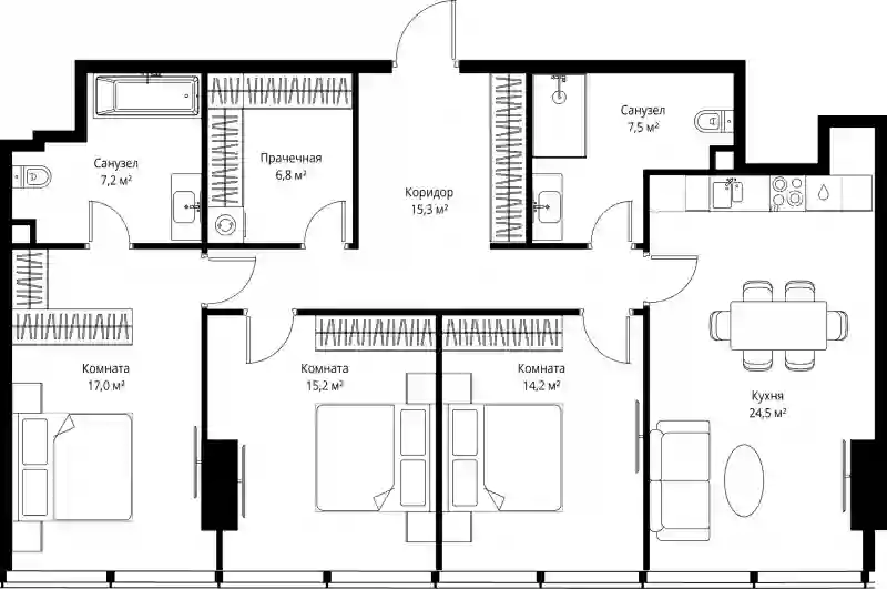 В комплексе предложено множество планировочных решений: в наличии квартиры, как классического типа, так и европланировки. Квартиры сдаются с подчистовой отделкой, высотой потолков 3 м и панорамным остеклением в пол.