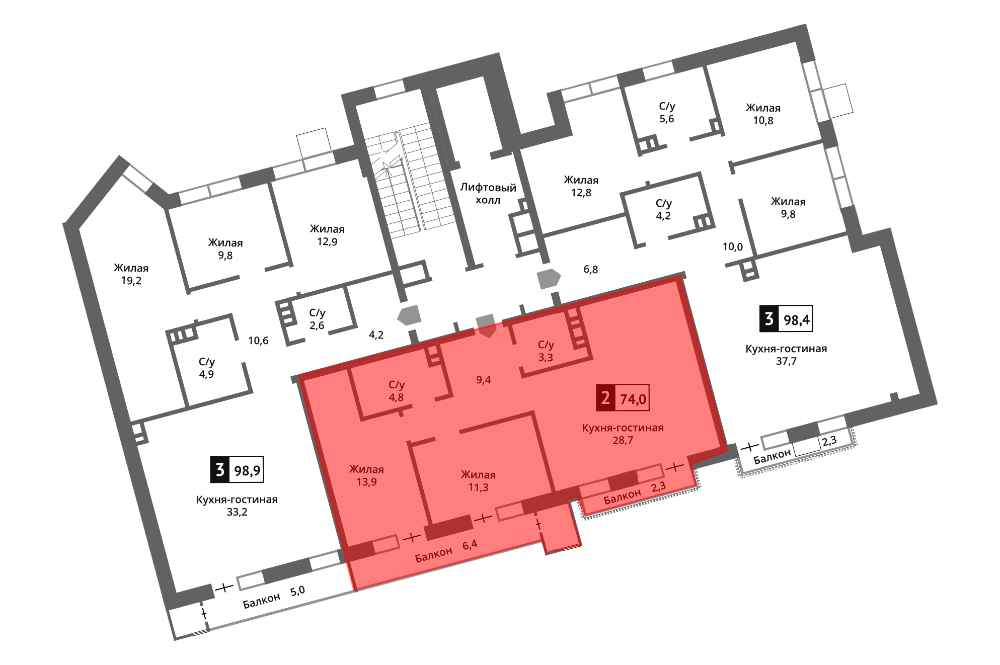 Все квартиры в комплексе выполнены в формате европланировок с просторными кухнями-гостиными и приватными спальнями. В части квартир балконы и лоджии остеклены, но есть также и варианты квартир с французскими балконами без остекления. Часть квартир выполнены в формате Лаунж Флэт с собственными террасами патио. На отдельной территории спроектированы дуплексы и индивидуальные жилые дома. Все квартиры в комплексе сдаются без отделки. Высота потолков в квартирах варьируется от 2,96 до 3,71 метра, а из окон открываются виды на реку.