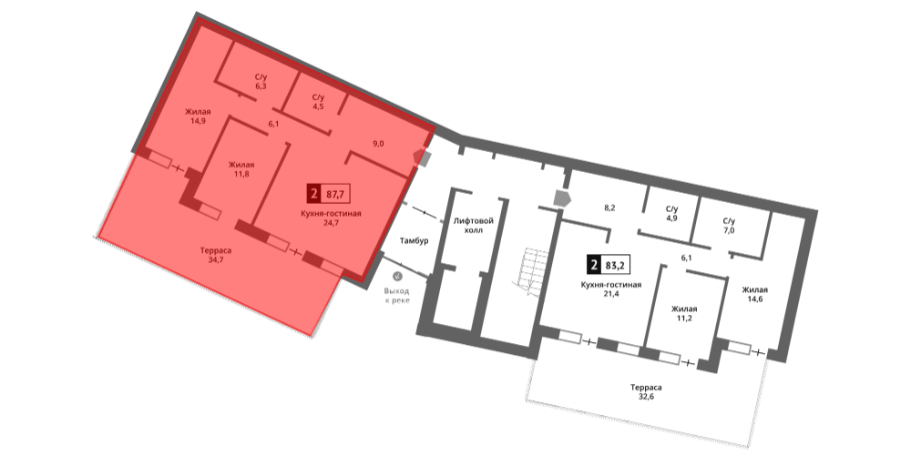 Все квартиры в комплексе выполнены в формате европланировок с просторными кухнями-гостиными и приватными спальнями. В части квартир балконы и лоджии остеклены, но есть также и варианты квартир с французскими балконами без остекления. Часть квартир выполнены в формате Лаунж Флэт с собственными террасами патио. На отдельной территории спроектированы дуплексы и индивидуальные жилые дома. Все квартиры в комплексе сдаются без отделки. Высота потолков в квартирах варьируется от 2,96 до 3,71 метра, а из окон открываются виды на реку.