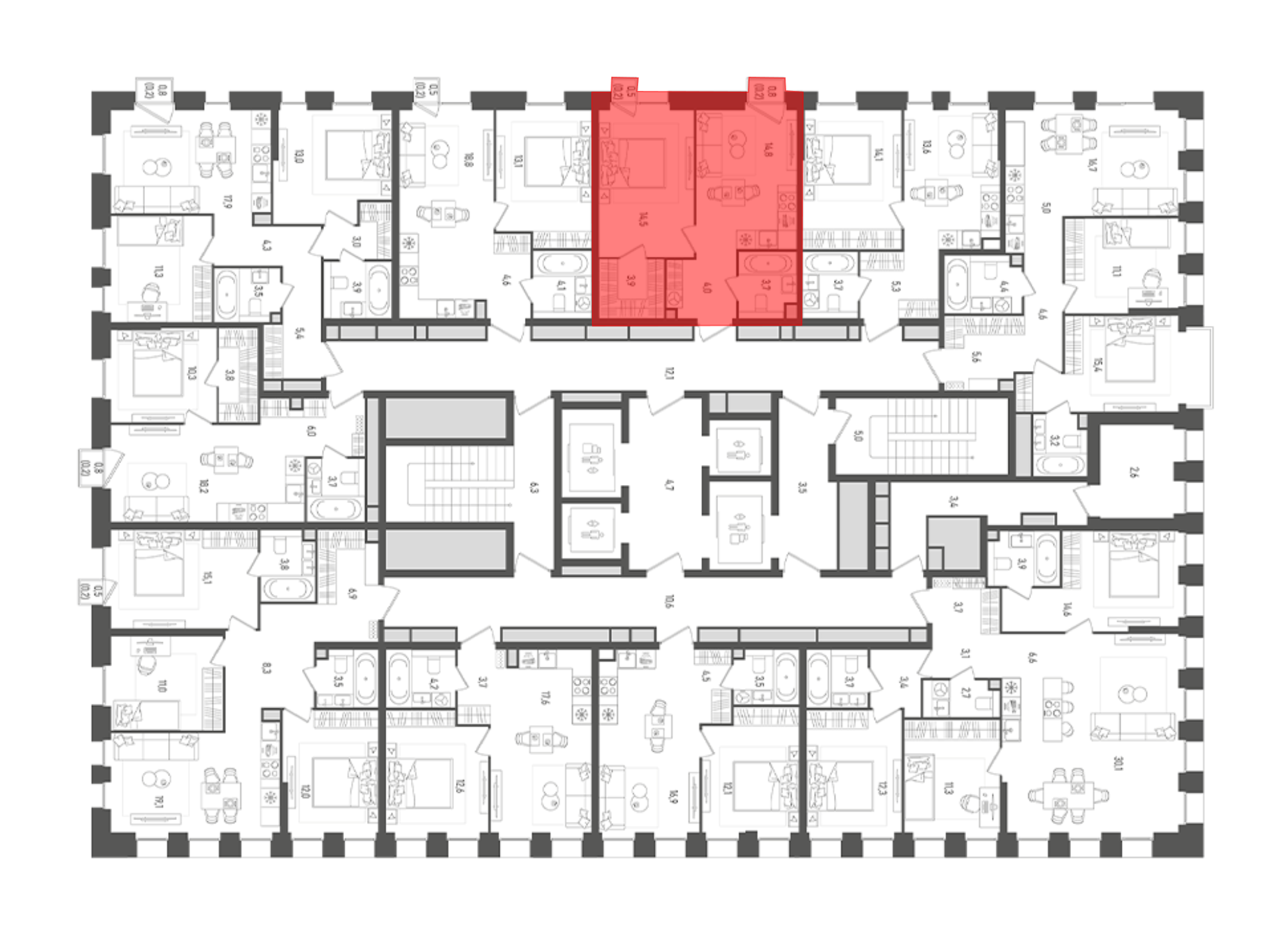В комплексе предложен широкий выбор планировочных решений от компактных студий площадью 28 кв. метров до просторных пентхаусов с каминами площадью до 156 кв. метров. Также представлены редкие форматы квартир: с террасой, мастер-спальней и окном в ванной комнате. Уникальность проекта заключается в разнообразии типов остекления: в наличии 48 вариантов, включая джабо-окна, французские балконы и эркеры. Высота потолков составляет 3,1 метра, а в пентхаусах достигает 3,6 метра.