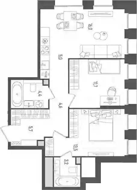 В комплексе предложен широкий выбор планировочных решений от компактных студий площадью 28 кв. метров до просторных пентхаусов с каминами площадью до 156 кв. метров. Также представлены редкие форматы квартир: с террасой, мастер-спальней и окном в ванной комнате. Уникальность проекта заключается в разнообразии типов остекления: в наличии 48 вариантов, включая джабо-окна, французские балконы и эркеры. Высота потолков составляет 3,1 метра, а в пентхаусах достигает 3,6 метра.