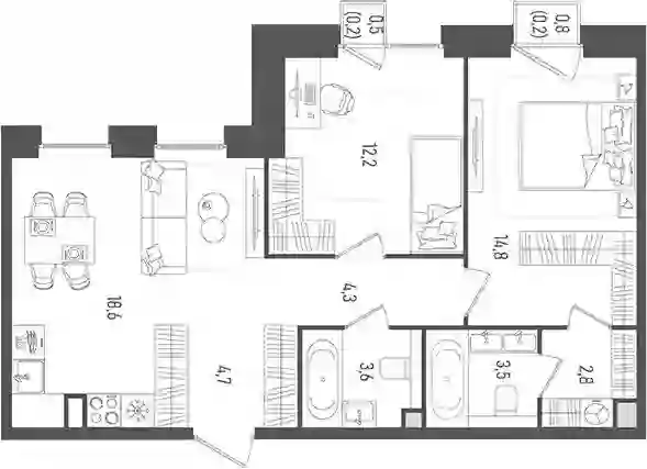 В комплексе предложен широкий выбор планировочных решений от компактных студий площадью 28 кв. метров до просторных пентхаусов с каминами площадью до 156 кв. метров. Также представлены редкие форматы квартир: с террасой, мастер-спальней и окном в ванной комнате. Уникальность проекта заключается в разнообразии типов остекления: в наличии 48 вариантов, включая джабо-окна, французские балконы и эркеры. Высота потолков составляет 3,1 метра, а в пентхаусах достигает 3,6 метра.