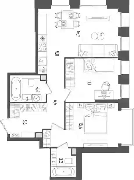В комплексе предложен широкий выбор планировочных решений от компактных студий площадью 28 кв. метров до просторных пентхаусов с каминами площадью до 156 кв. метров. Также представлены редкие форматы квартир: с террасой, мастер-спальней и окном в ванной комнате. Уникальность проекта заключается в разнообразии типов остекления: в наличии 48 вариантов, включая джабо-окна, французские балконы и эркеры. Высота потолков составляет 3,1 метра, а в пентхаусах достигает 3,6 метра.