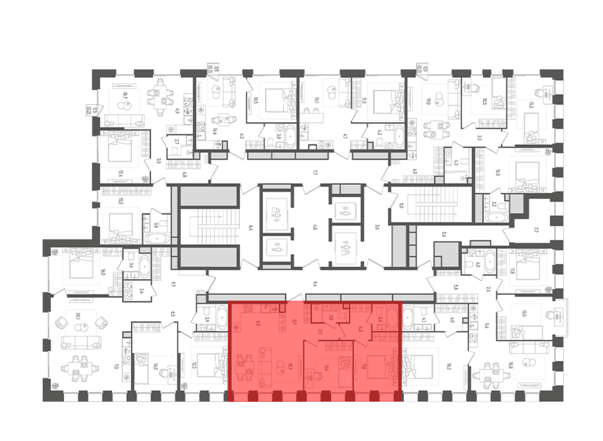 В комплексе предложен широкий выбор планировочных решений от компактных студий площадью 28 кв. метров до просторных пентхаусов с каминами площадью до 156 кв. метров. Также представлены редкие форматы квартир: с террасой, мастер-спальней и окном в ванной комнате. Уникальность проекта заключается в разнообразии типов остекления: в наличии 48 вариантов, включая джабо-окна, французские балконы и эркеры. Высота потолков составляет 3,1 метра, а в пентхаусах достигает 3,6 метра.