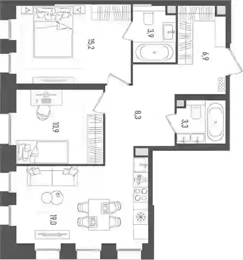 В комплексе предложен широкий выбор планировочных решений от компактных студий площадью 28 кв. метров до просторных пентхаусов с каминами площадью до 156 кв. метров. Также представлены редкие форматы квартир: с террасой, мастер-спальней и окном в ванной комнате. Уникальность проекта заключается в разнообразии типов остекления: в наличии 48 вариантов, включая джабо-окна, французские балконы и эркеры. Высота потолков составляет 3,1 метра, а в пентхаусах достигает 3,6 метра.