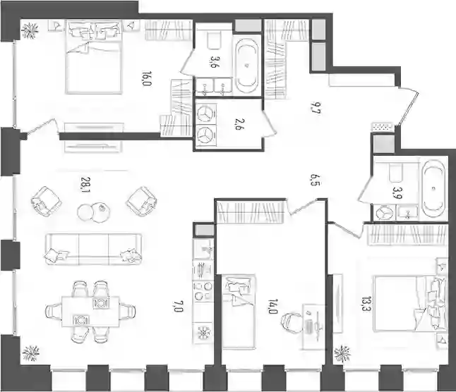 В комплексе предложен широкий выбор планировочных решений от компактных студий площадью 28 кв. метров до просторных пентхаусов с каминами площадью до 156 кв. метров. Также представлены редкие форматы квартир: с террасой, мастер-спальней и окном в ванной комнате. Уникальность проекта заключается в разнообразии типов остекления: в наличии 48 вариантов, включая джабо-окна, французские балконы и эркеры. Высота потолков составляет 3,1 метра, а в пентхаусах достигает 3,6 метра.