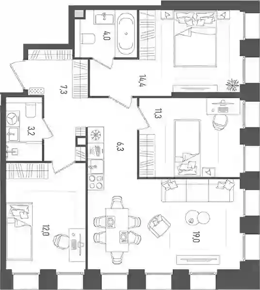 В комплексе предложен широкий выбор планировочных решений от компактных студий площадью 28 кв. метров до просторных пентхаусов с каминами площадью до 156 кв. метров. Также представлены редкие форматы квартир: с террасой, мастер-спальней и окном в ванной комнате. Уникальность проекта заключается в разнообразии типов остекления: в наличии 48 вариантов, включая джабо-окна, французские балконы и эркеры. Высота потолков составляет 3,1 метра, а в пентхаусах достигает 3,6 метра.