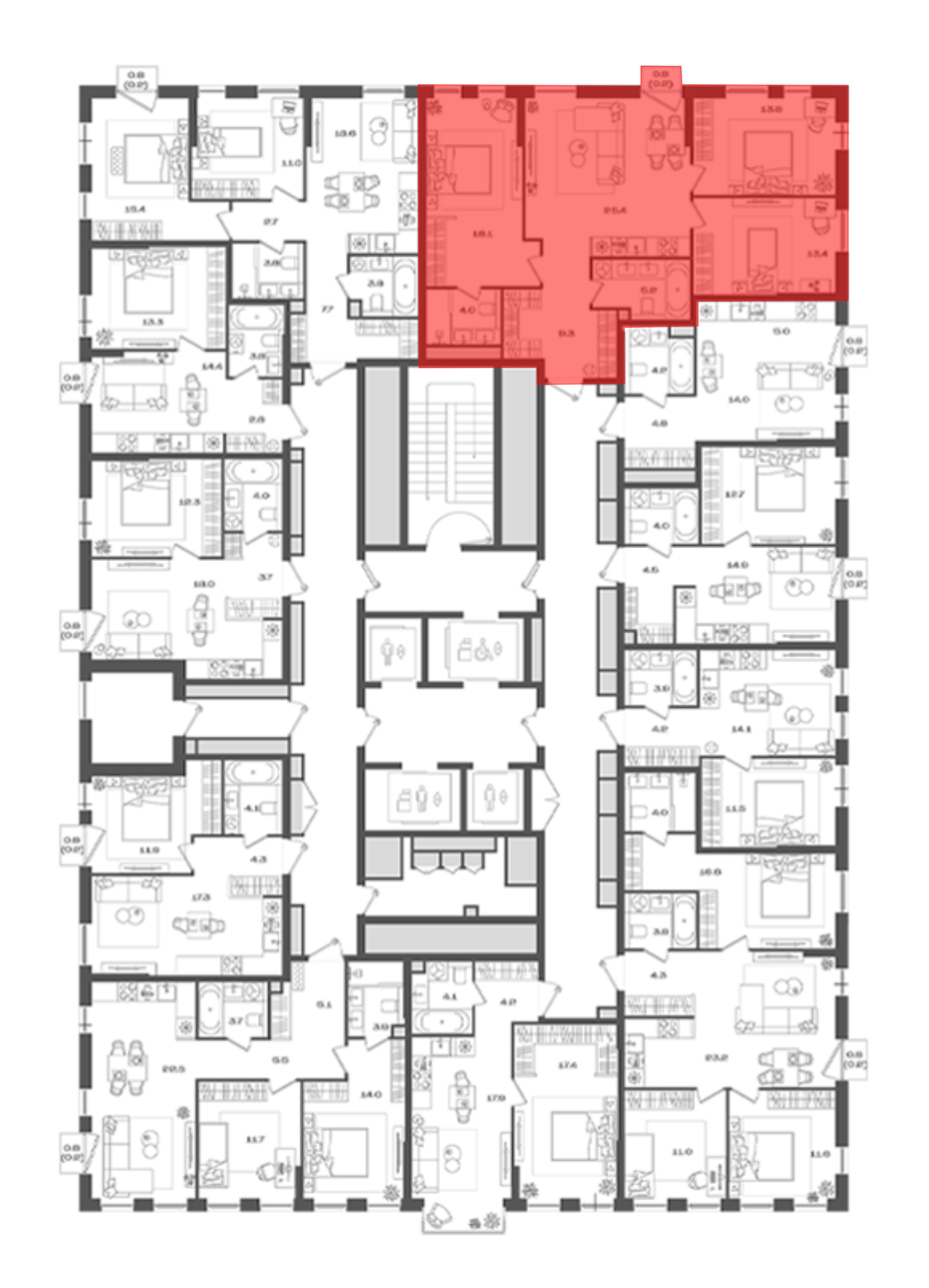 В комплексе предложен широкий выбор планировочных решений от компактных студий площадью 28 кв. метров до просторных пентхаусов с каминами площадью до 156 кв. метров. Также представлены редкие форматы квартир: с террасой, мастер-спальней и окном в ванной комнате. Уникальность проекта заключается в разнообразии типов остекления: в наличии 48 вариантов, включая джабо-окна, французские балконы и эркеры. Высота потолков составляет 3,1 метра, а в пентхаусах достигает 3,6 метра.