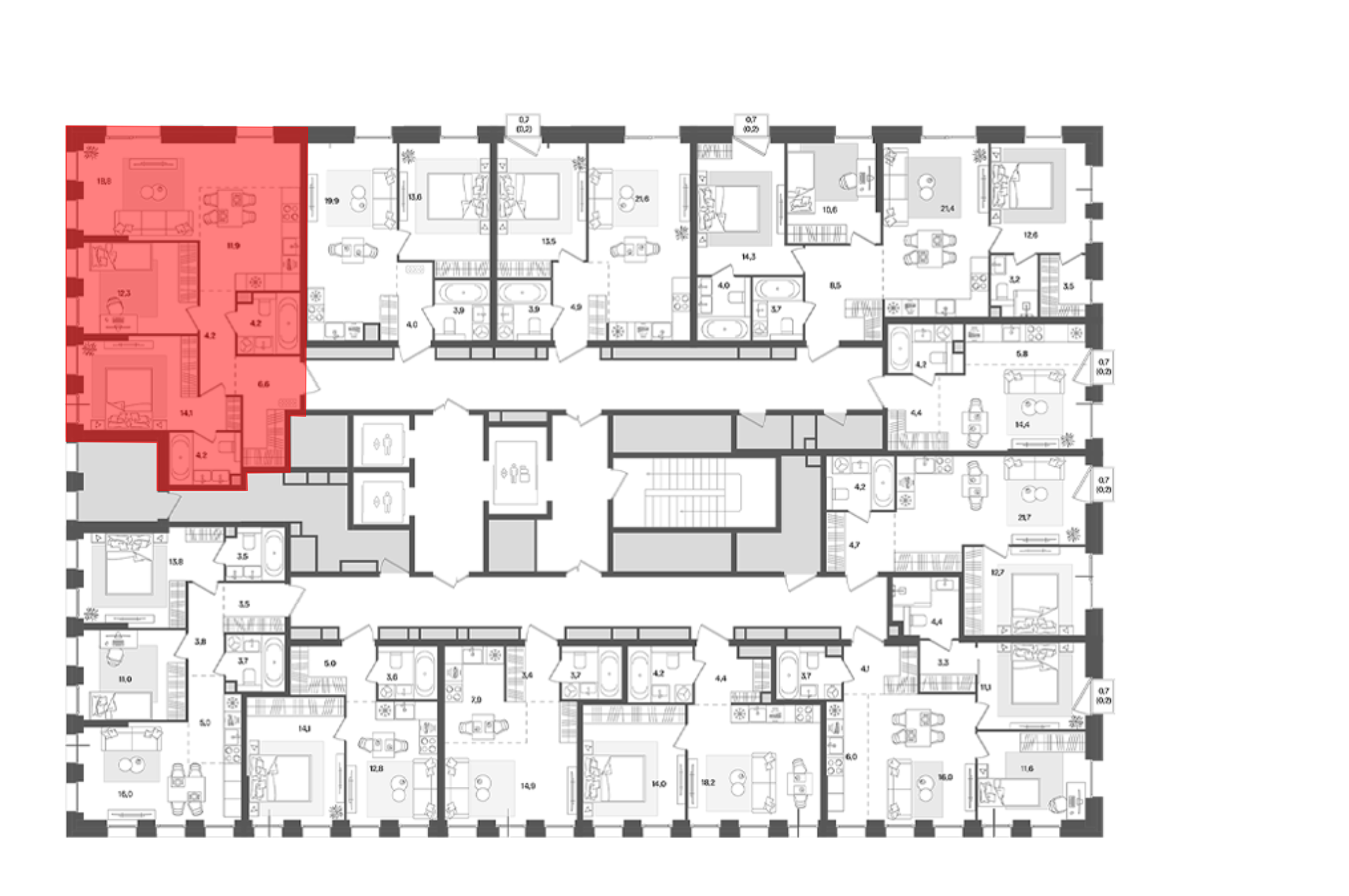 В комплексе предложен широкий выбор планировочных решений от компактных студий площадью 28 кв. метров до просторных пентхаусов с каминами площадью до 156 кв. метров. Также представлены редкие форматы квартир: с террасой, мастер-спальней и окном в ванной комнате. Уникальность проекта заключается в разнообразии типов остекления: в наличии 48 вариантов, включая джабо-окна, французские балконы и эркеры. Высота потолков составляет 3,1 метра, а в пентхаусах достигает 3,6 метра.