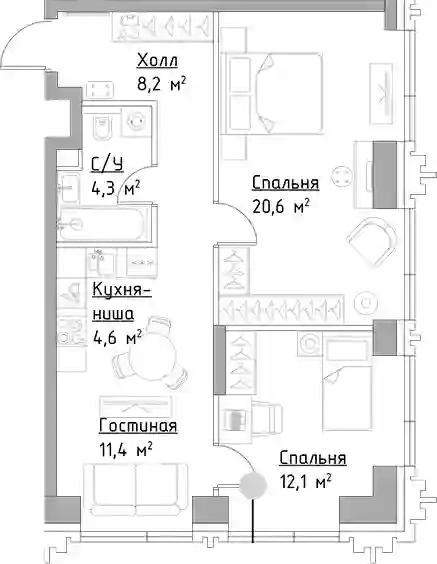 В комплексе предложен широкий выбор планировочных решений: от компактных студий площадью 22 кв. метра до просторных резиденций площадью 120 кв. метров. Планировками предусмотрены мастер-спальни с гардеробной и санузлом, просторные кухни-гостиные, гардеробные и системы хранения, выделенные рабочие зоны в спальнях и террасы с панорамным видом на город. Во всех квартирах панорамные окна и высокие потолки от 2,85 метра. Квартиры сдаются с отделкой White box.