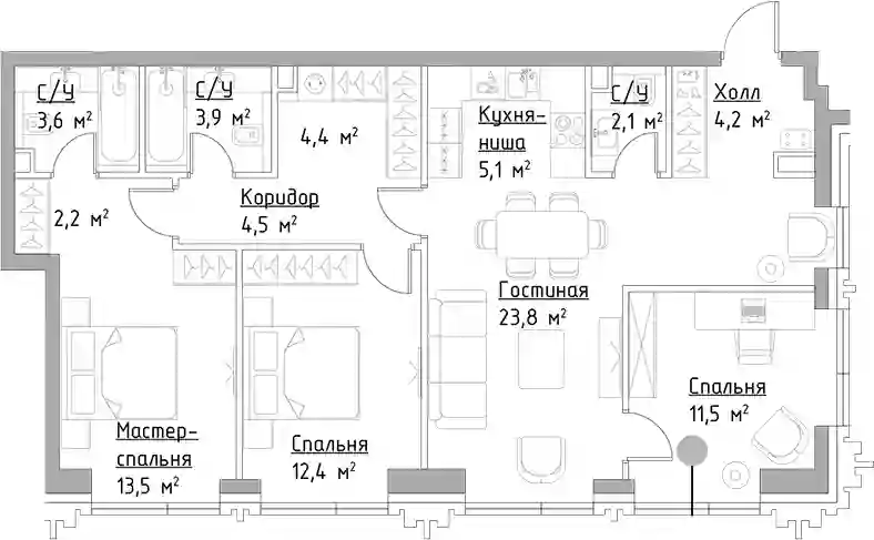 В проекте предложен широкий выбор планировочных решений от студий до 4-комнатных квартир. Есть лоты с кухнями-гостиными, мастер-спальнями, террасами, эркерами, лоджиями и балконами. Все квартиры представлены в подчистовой отделке White box по стандарту MR Base. Из панорамных окон открывается вид на парк и набережную Сходненского канала.