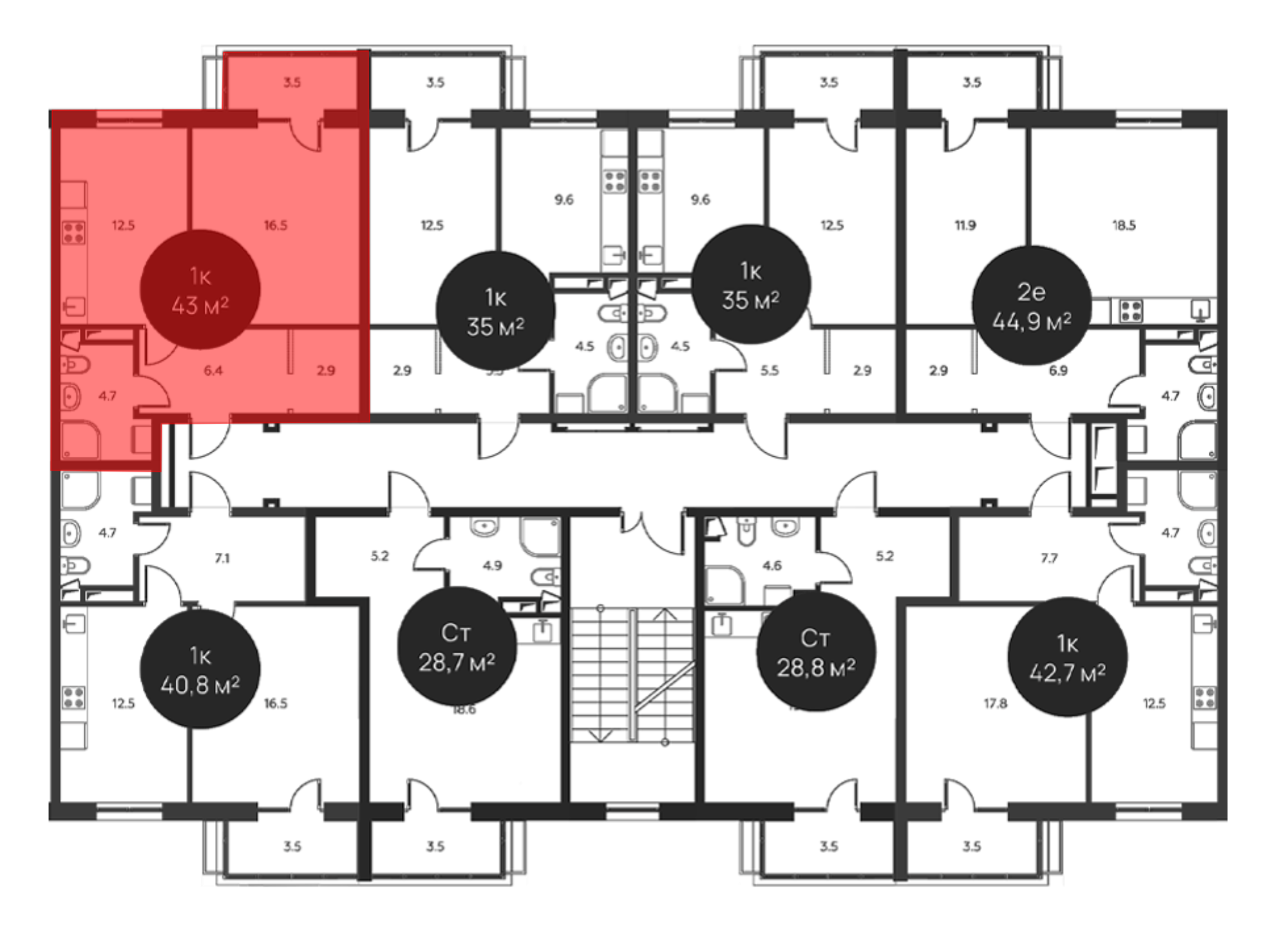 В комплексе представлены квартиры с 1–3 спальнями площадью от 26 до 73 кв. м. В каждой квартире есть балкон, а в 3-комнатных — 2 санузла. Высота потолков варьируется от 3 до 3.15 метра.