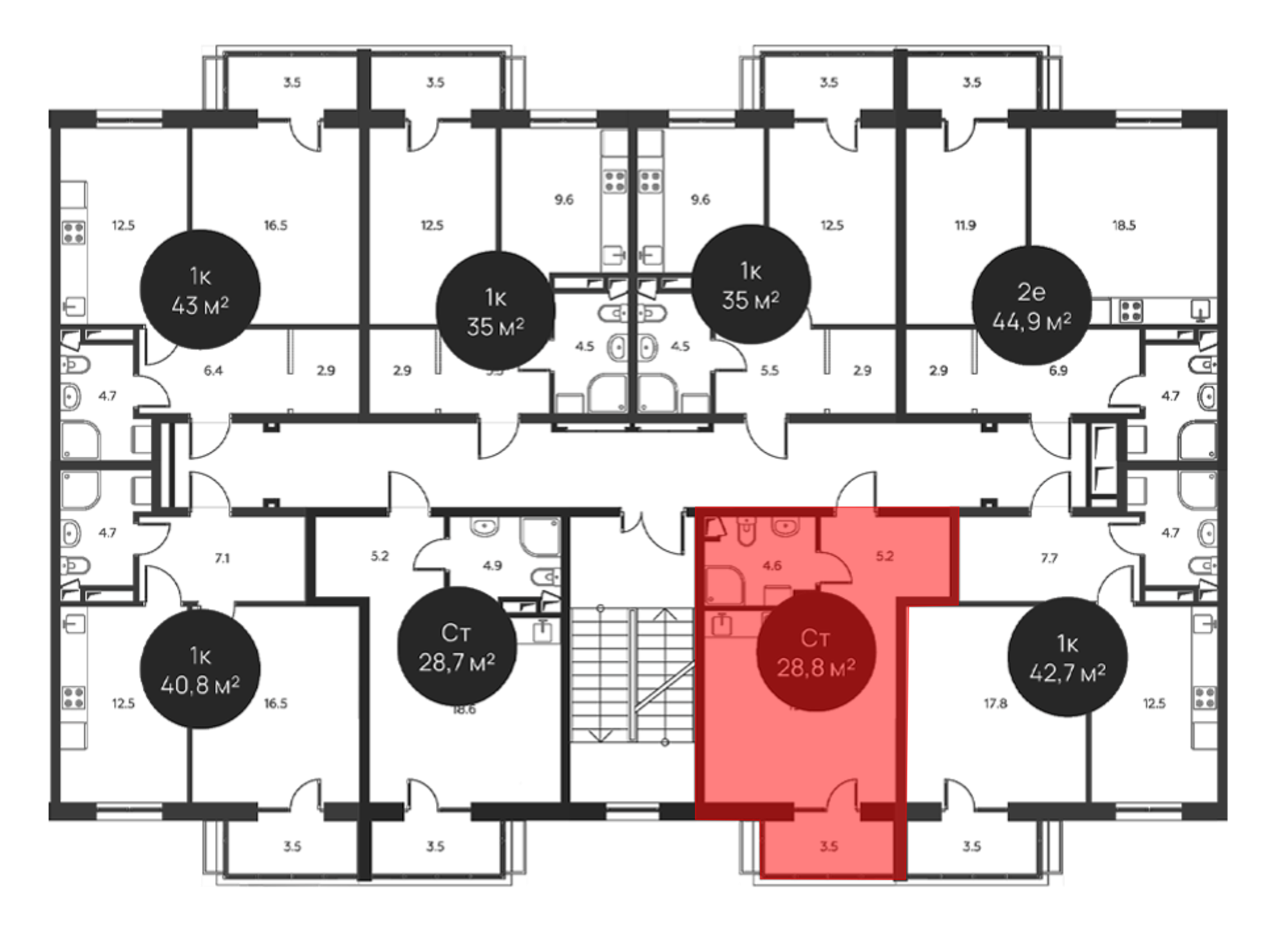В комплексе представлены квартиры с 1–3 спальнями площадью от 26 до 73 кв. м. В каждой квартире есть балкон, а в 3-комнатных — 2 санузла. Высота потолков варьируется от 3 до 3.15 метра.