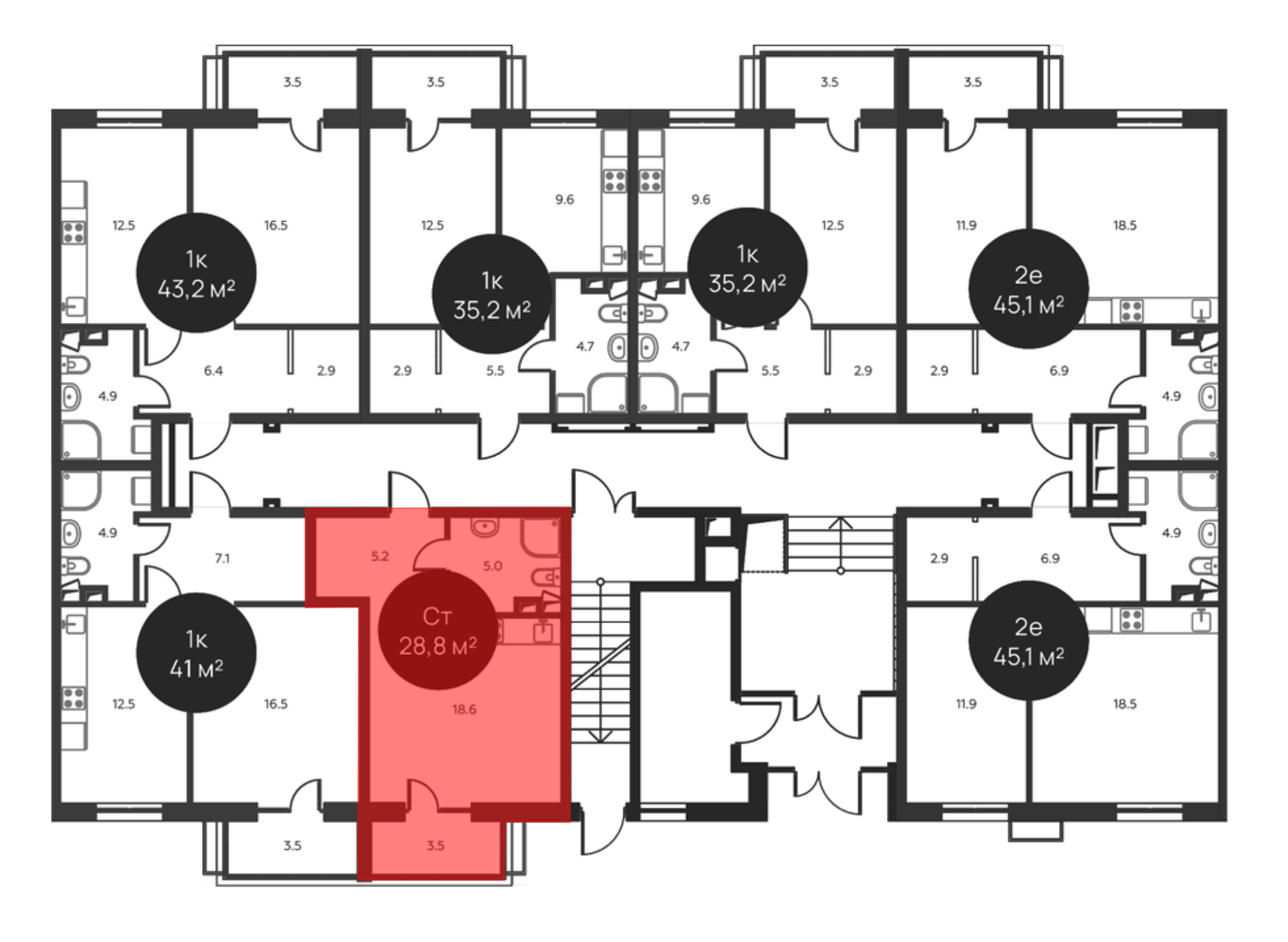 В комплексе представлены квартиры с 1–3 спальнями площадью от 26 до 73 кв. м. В каждой квартире есть балкон, а в 3-комнатных — 2 санузла. Высота потолков варьируется от 3 до 3.15 метра.