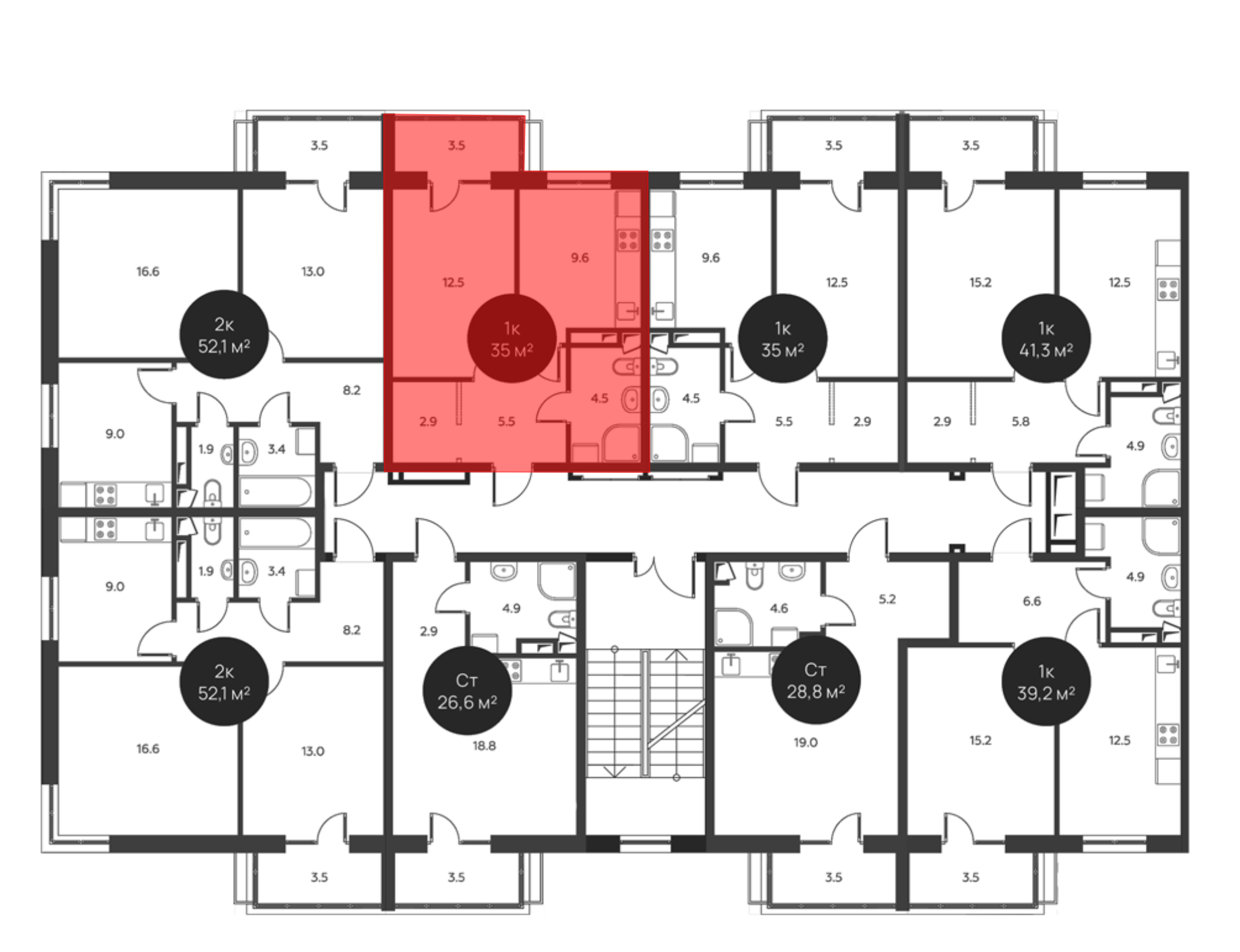 В комплексе представлены квартиры с 1–3 спальнями площадью от 26 до 73 кв. м. В каждой квартире есть балкон, а в 3-комнатных — 2 санузла. Высота потолков варьируется от 3 до 3.15 метра.