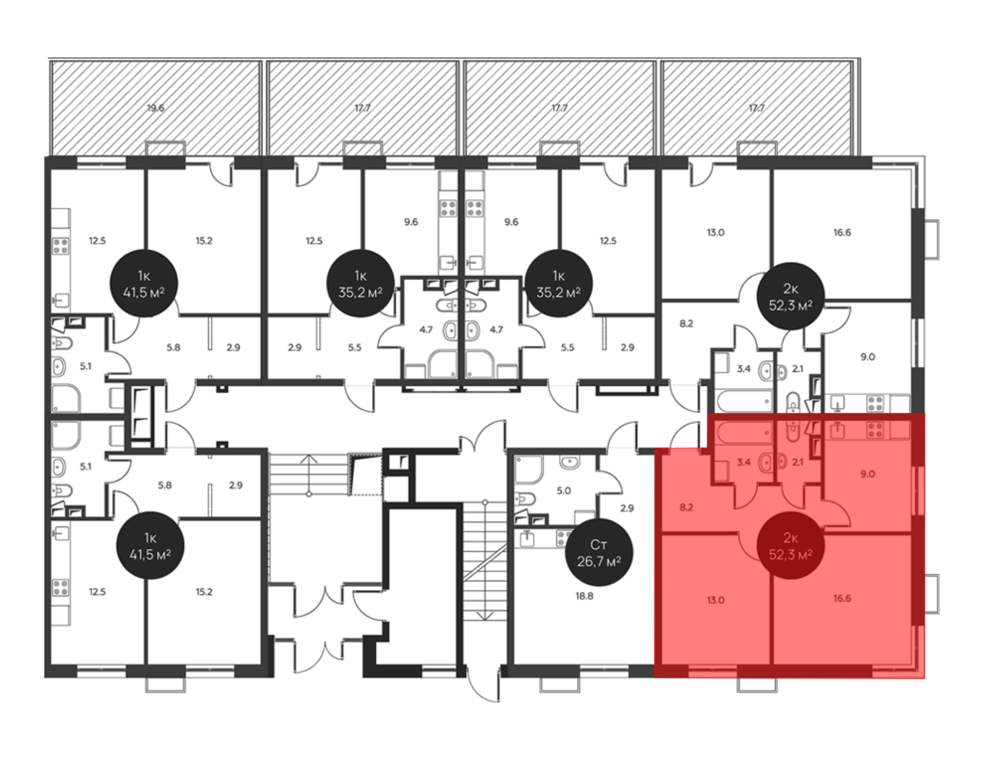 В комплексе представлены квартиры с 1–3 спальнями площадью от 26 до 73 кв. м. В каждой квартире есть балкон, а в 3-комнатных — 2 санузла. Высота потолков варьируется от 3 до 3.15 метра.
